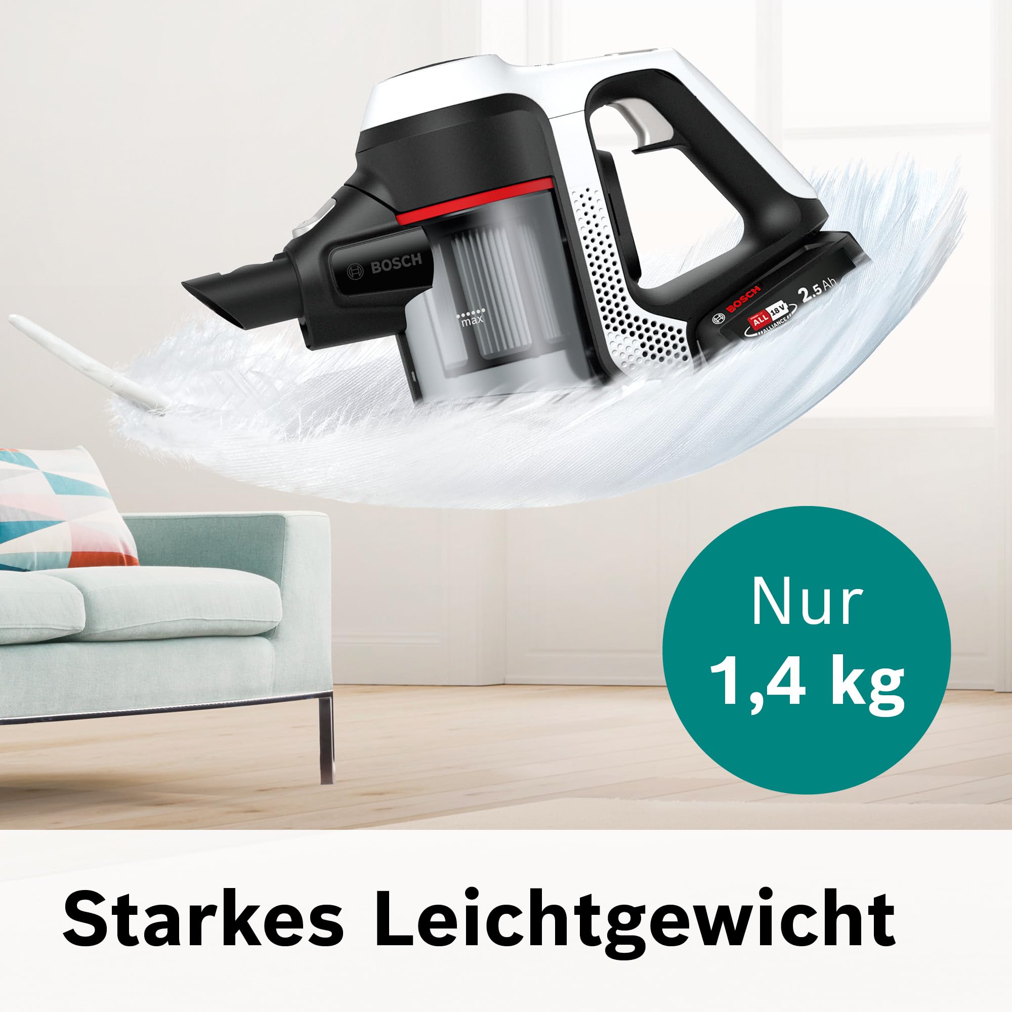 - Wechselbarer 2.5 Ah Akku: Als Teil der Power For All Alliance ist der Akku mit zahlreichen Produkten von Bosch und anderen Marken kompatibel
